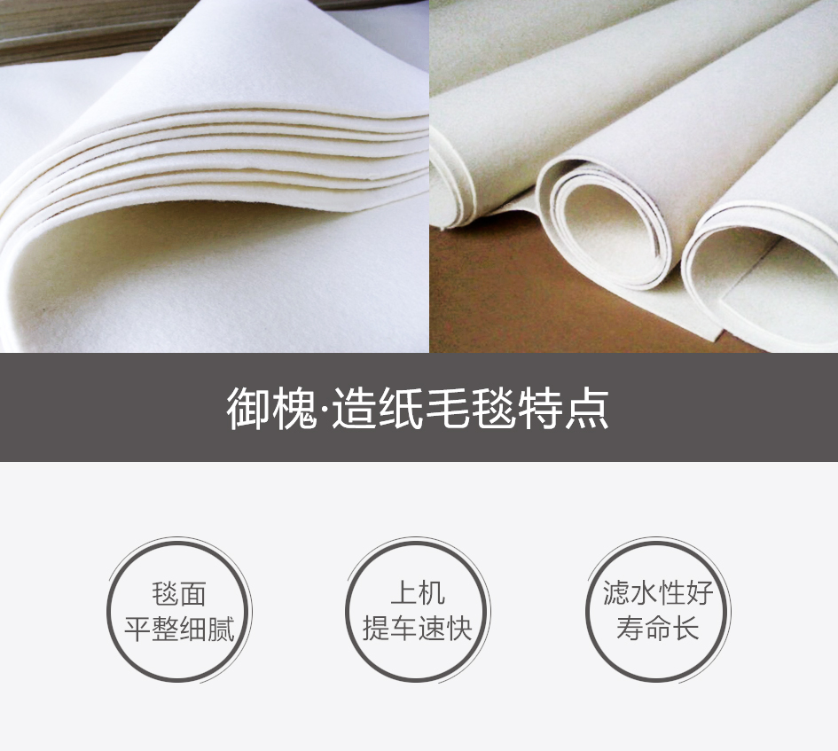 車速:80-250m/min 可選用品種: BOM 1+1;1+2疊層毯 脫水性好,尺寸規(guī)格穩(wěn)定、抗污、耐磨性能強(qiáng),使用壽命長(zhǎng)??酥?50—1400g/㎡